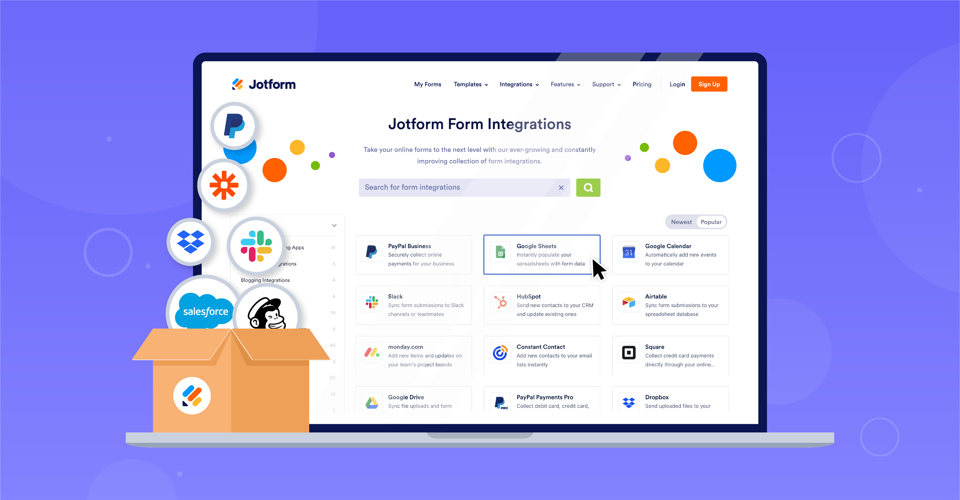 Automatically send form submissions to email marketing services, project management boards, CRMs, cloud storage apps, and more with Jotform’s 150+ integrations.