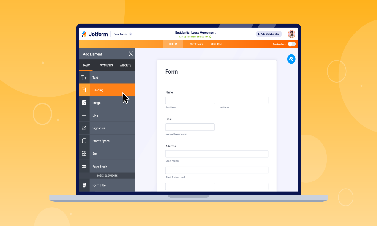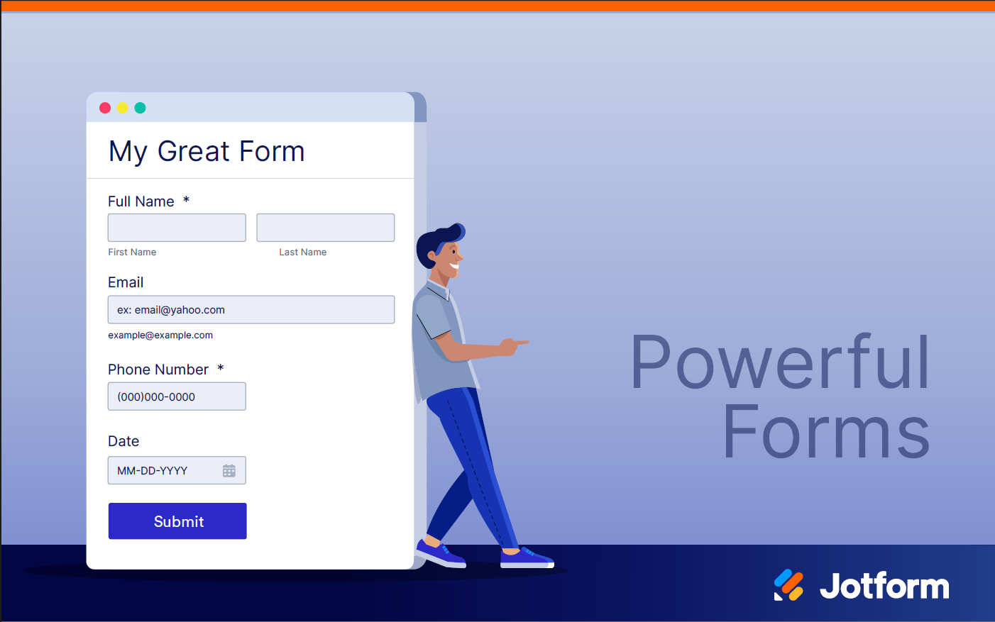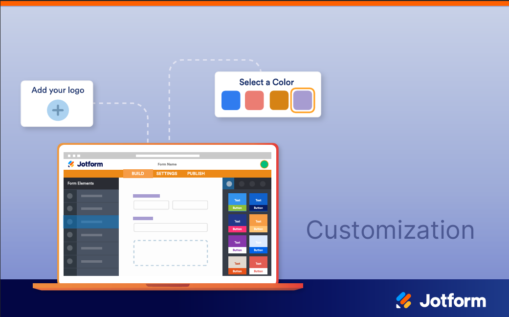 Create professional-looking forms with no coding using Jotform’s online Form Builder. Then style your forms with your own logo, fonts, and colors.