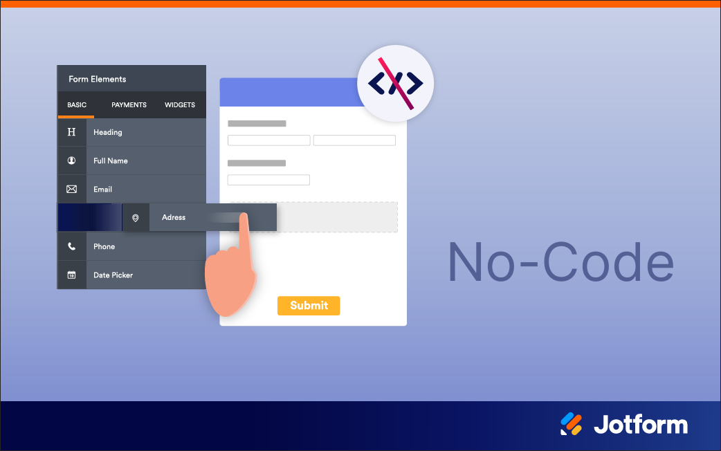 With Jotform, simply drag and drop form elements to build a form in minutes. There’s no code and no developer required.